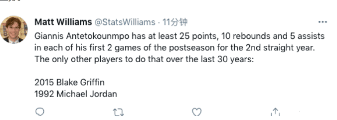 砍下31分13篮板6助攻的字母哥也成为过去30年第三个能连续两年季后赛前两战场均25+10+5的球员,此前做到这一成就的是格里芬和乔丹。