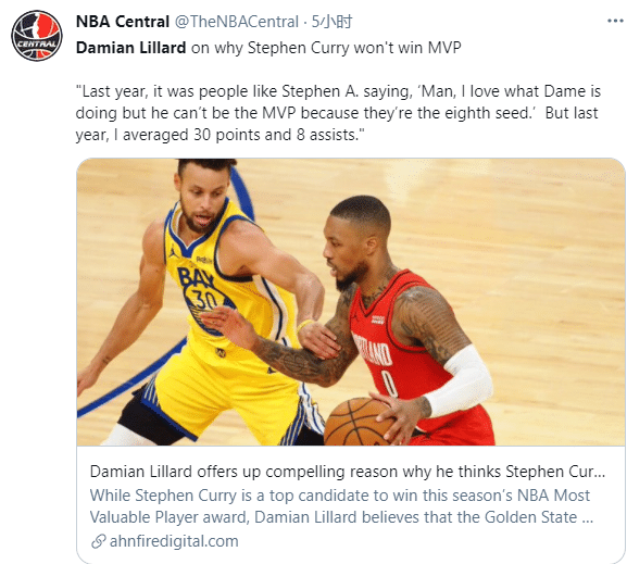 不久前,利拉德谈到库里能否夺得本赛季MVP的话题,利指导表示库里无法赢得MVP,他表示:就像去年A-史密斯说的一样——我喜欢利拉德,但他们排在西部第八,他不能赢得MVP。
