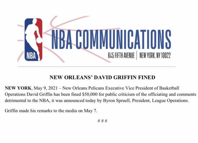 优直播讯 北京时间5月10日,NBA官方宣布,因公开批评裁判和发表对NBA不利言论,鹈鹕队的篮球运营副总裁兼总经理大卫-格里芬被罚款50000美元。
