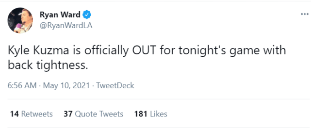 优直播讯 北京时间5月10日,湖人官方宣布,库兹马因腰部肌肉紧张缺席今日对太阳的比赛。一天前,库兹马的状态就列为doubtful(大概率不打),而今天赛前,库兹马的状态正式更改为OUT(缺阵)。詹姆斯、施罗德仍未复出,湖人缺兵少将的问题变得更加严重。
