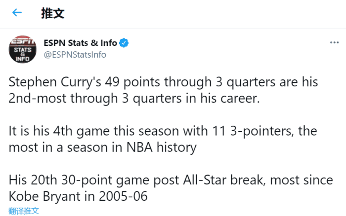 据ESPN统计,三节49分追平库里生涯三节得分第二高纪录!这是他本赛季第4次单场11记三分,NBA历史单赛季最多!另外全明星后,库里已经20次砍下30+,是自05-06赛季科比后最多的!