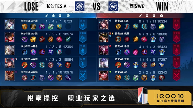 开局双方正常抢线。1分08秒中路西安WE击杀姜子牙,拿下一血。2分31秒西安WE拿下暴君。3分31秒对抗路长沙TES.A击杀镜,拿下主宰。6分46秒长沙TES.A摧毁敌方发育路外塔、对抗路外塔、中路外塔,西安WE拿下暴君,摧毁敌方发育路外塔。7分59秒野区长沙TES.A击杀猪八戒,打出0换1。8分36秒西安WE关键抢夺主宰,对抗路击杀东皇太一,摧毁敌方对抗路外塔。9分40秒西安WE摧毁敌方对抗路二塔。10分26秒长沙TES.A拿下暗影主宰,西安WE拿下暗影暴君。10分55秒西安WE摧毁敌方发育路二塔,打出1换2。11分30秒中路西安WE干将莫邪二连击破,打出2换2,摧毁敌方中路外塔。14分26秒野区团战双方打出1换1,西安WE拿下暗影主宰。15分14秒野区长沙TES.A击杀猪八戒,打出0换1。16分31秒中路西安WE击杀夏侯惇,摧毁敌方中路二塔。17分57秒西安WE拿下暗影暴君,19分01秒拿下暗影主宰。19分44秒野区团战长沙TES.A娜可露露二连击破,打出0换2。20分34秒长沙TES.A拿下风暴龙王,西安WE摧毁敌方对抗路高地。21分34秒长沙TES.A摧毁敌方中路二塔。22分43秒野区团战双方打野互换,长沙TES.A摧毁敌方中路高地。24分08秒西安WE拿下风暴龙王。25分09秒西安WE摧毁敌方发育路高地、中路高地,长沙TES.A击杀镜,西安WE马可波罗三连决胜,摧毁水晶拿下比赛。