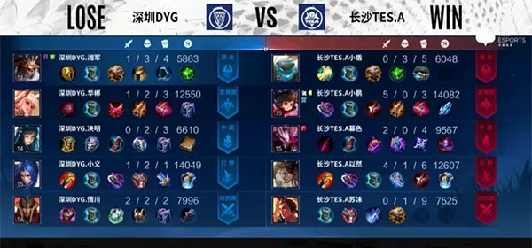开局22秒,深圳DYG击杀明世隐,拿下超快一血,前期双方再无其他人头爆发,互为均势;中期,小义澜找到机会单点击破,深圳DYG经济略微领先;后期长沙TES.A运营兵线直上高地,抓对面掉点找到节奏;风暴龙王团战,以然阿古朵拿到龙王,随后长沙TES.A反打打出一换二;最后一波,长沙TES.A团战一换五,顺势推上水晶,先下一城!