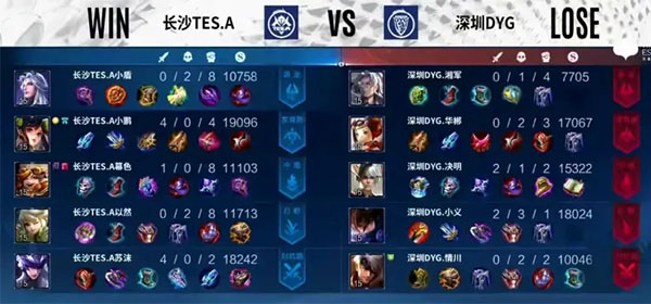 前期频发小摩擦,双方一换一,经济持平;中期,双方互相拉扯,互抓掉点,深圳DYG经济略微领先;十二分钟,深圳DYG率先出击,长沙TES.A找到机会反打,团战打出零换二,顺势压进,连下三塔;十六分钟,苏沫吕布大招开到三人,小鹏李元芳二连击破,后续长沙TES.A打对面持续掉点,推掉水晶,再下一城!