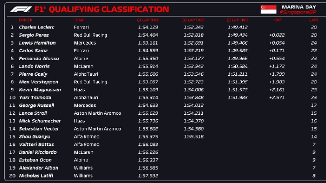 优直播讯 2022年F1新加坡大奖赛排位赛在滨海湾赛道结束。Q3竞争非常激烈,最快圈速多次被刷新!最终,法拉利车队勒克莱尔继2019年后,再次拿到新加坡大奖赛的杆位!红牛车队佩雷兹第二,梅赛德斯车队汉密尔顿第三!维斯塔潘第八,中国车手周冠宇第15。