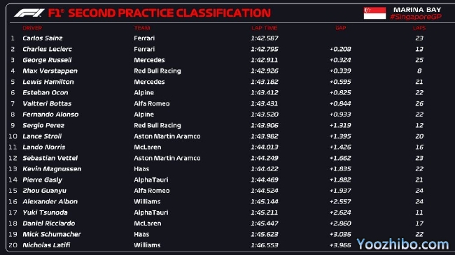 2022年F1新加坡大奖赛第2次练习赛成绩表: