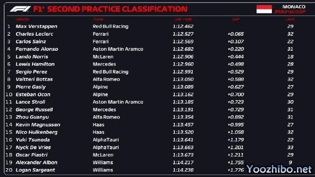 优直播讯 2023年F1摩纳哥大奖赛第二次练习赛结束。最终红牛车队维斯塔潘凭借1:12.462的成绩取得二练头名,法拉利车队勒克莱尔第二,软胎单圈与维斯塔潘的差距只有0.065秒;塞恩斯第三,落后维斯塔潘0.107秒。