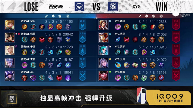 第一局开局西安WE发育路、对抗路换线。3分48秒西安WE拿下先知主宰。4分05秒XYG拿下暴君。4分50秒西安WE野区击杀东皇太一拿下一血。5分43秒双方互换边路外塔。6分钟野区团双方打出1换1。6分47秒XYG摧毁敌方中路外塔。7分18秒双方再次镜像换掉边路外塔。8分01秒XYG拿下主宰。9分钟对抗路团XYG打出2换4。10分34秒西安WE拿下暗影暴君。10分56秒XYG拿下暗影主宰。11分02秒西安WE摧毁敌方发育路二塔。11分28秒西安WE野区击杀廉颇。12分25秒中路团XYG击杀王昭君。13分08秒XYG摧毁敌方发育路二塔。14分53秒XYG中路击杀镜。15分05秒XYG拿下暗影主宰。15分20秒对抗路团XYG打出0换2,随后摧毁敌方对抗路二塔。16分07秒XYG摧毁敌方中路高地塔。16分35秒XYG摧毁敌方对抗路高地塔,高地团双方4换4。17分40秒西安WE拿下暗影暴君。18分25秒野区团西安WE打出0换2,随后摧毁敌方中路外塔。19分03秒西安WE拿下暗影主宰。20分钟发育路团XYG打出2换3,西安WE摧毁敌方发育路高地塔。22分24秒XYG拿下风暴龙王。22分35秒西安WE发育路击杀廉颇。24分10秒龙坑处团战XYG打出1换2。25分38秒XYG拿下风暴龙王。28分35秒中路团西安WE打出1换3。29分39秒西安WE拿下风暴龙王。30分15秒西安WE先后摧毁敌方对抗路二塔、高地塔。30分47秒XYG高地处击杀蒙恬。33分30秒风暴龙王处团战西安WE打出1换5团灭对手。34分15秒西安WE摧毁敌方水晶拿下比赛。