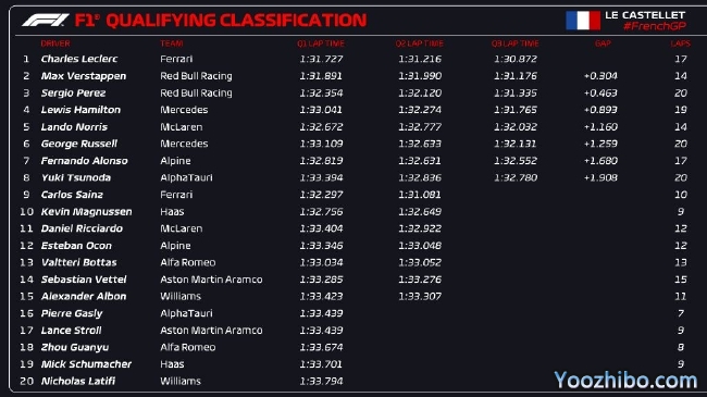 2022年F1法国大奖赛排位赛成绩表