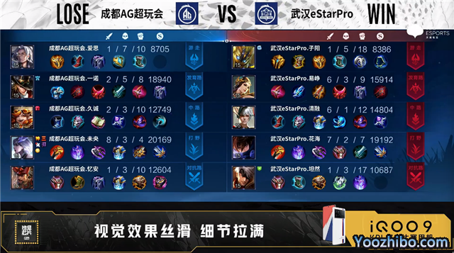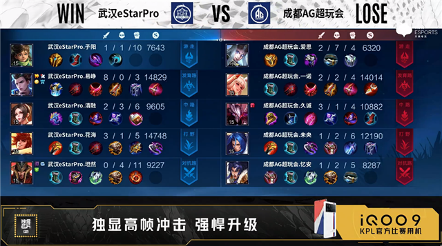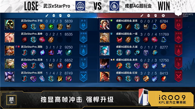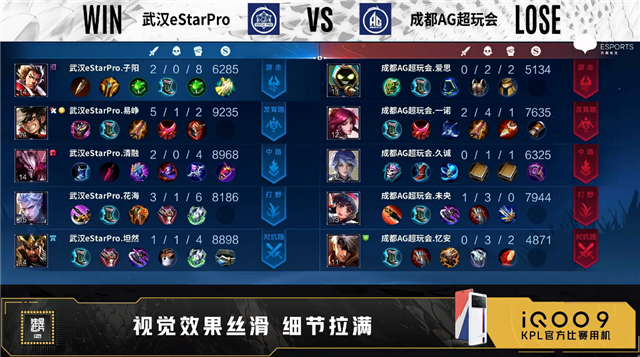 双方常规开局。2分49秒成都AG中路击杀不知火舞拿到一血。3分07秒成都AG拿下暴君。3分30秒武汉eStar拿下主宰,4分24秒主宰处双方1换1。5分19秒武汉eStar摧毁敌方对抗路外塔。5分48秒发育路团战武汉eStar打出1换2,5分55秒武汉eStar裴擒虎野区单杀橘右京。6分38秒成都AG中路击杀不知火舞。7分38秒武汉eStar拿下暴君。7分51秒武汉eStar野区击杀东皇太一。8分17秒武汉eStar摧毁敌方中路外塔。8分45秒成都AG野区击杀蒙恬。9分52秒双方野区1换1。10分08秒武汉eStar拿下暗影主宰。10分48秒武汉eStar拿下暗影暴君。11分17秒武汉eStar野区击杀项羽。11分47秒武汉eStar摧毁敌方发育路高地塔。12分30秒武汉eStar摧毁敌方对抗路二塔。13分03秒成都AG对抗路打出1换2。14分35秒武汉eStar拿下暗影暴君。15分47秒武汉eStar拿下暗影主宰。16分43秒武汉eStar摧毁敌方对抗路高地塔。17分17秒团战武汉eStar打出1换2并摧毁敌方中路高地塔。18分42秒武汉eStar中路打出0换4。18分44秒武汉eStar摧毁敌方水晶拿下比赛。