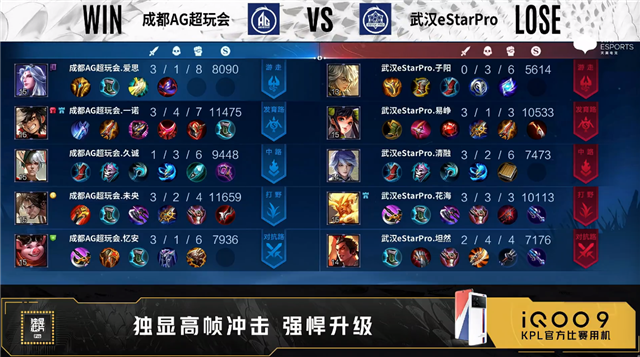 双方常规开局。47秒成都AG后羿发育单杀公孙离拿到一血。48秒武汉eStar对抗路击杀吕布。1分44秒成都AG中路击杀沈梦溪。3分19秒武汉eStar中路击杀王昭君。3分33秒武汉eStar对抗路打出1换2。5分34秒成都AG澜对抗路单杀马超。5分49秒成都AG拿下主宰。6分23秒武汉eStar发育路击杀澜。7分11秒成都AG中路击杀阿古朵。9分15秒成都AG野区打出0换2。9分35秒成都AG摧毁敌方中路外塔。10分37秒成都AG击杀阿古朵并拿下暗影暴君。11分53秒成都AG拿下暗影主宰。12分58秒成都AG摧毁敌方发育路高地塔。13分41秒成都AG高地击杀公孙离。13分54秒成都AG摧毁敌方中路、对抗路高地塔。14分11秒成都AG高地前打出0换3。14分20秒成都AG摧毁敌方水晶拿下比赛。