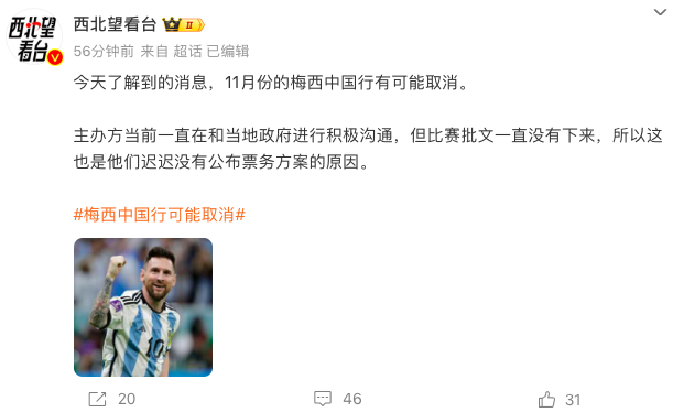 优直播10月19日,来自国内知名媒体“西北望看台”的消息,11月份的迈阿密国际队中国行可能会取消。阿根廷巨星梅西1年内第2次来华的计划,可能会因此搁浅。