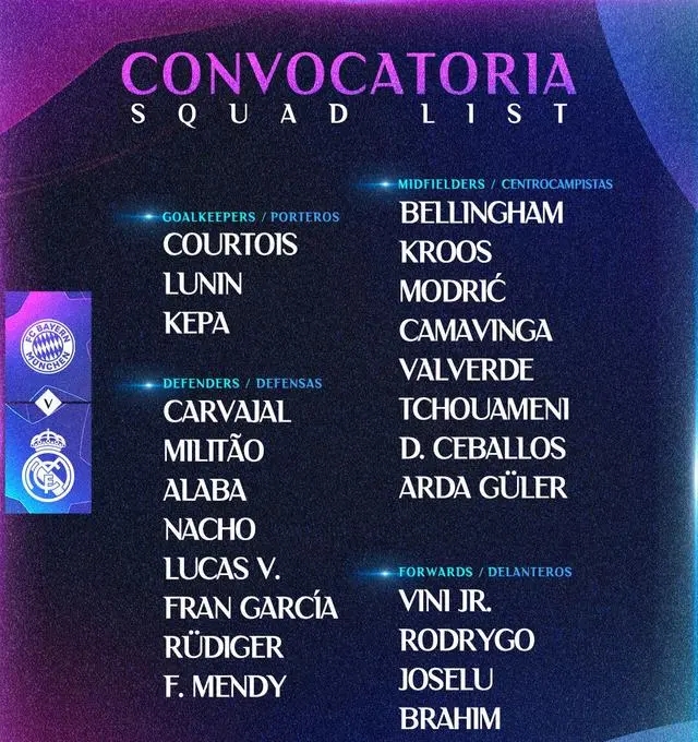 优直播讯 北京时间4月28日,皇马公布欧冠客战拜仁大名单,贝林厄姆领衔 巴尔韦德、维尼修斯在列。