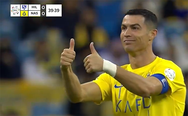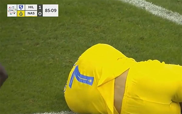 C罗在进攻端被利雅得新月的门将布努扑倒,非常痛苦,倒地的C罗示意自己被拳击,很显然裁判没有给点球,在得知没有点球判罚之后,C罗无奈的模仿了裁判判罚没有点球的手势,非常不服气。
