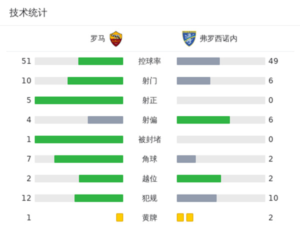 最终全场比赛结束,罗马2-0弗洛西诺内。