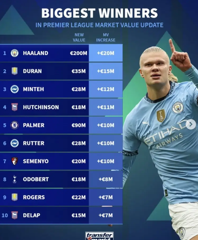 这次身价更新反映出哈兰德在曼城以及整个欧洲足坛的火热状态,而德布劳内可能因为年龄和伤病问题导致身价有所下滑。不过,身价并不能完全反映球员的实际能力,两人在球场上的表现仍然是曼城争夺各项冠军的重要保障。